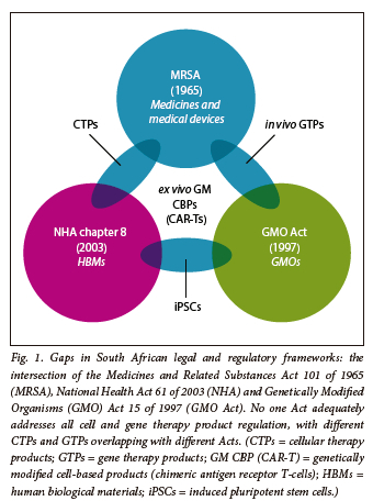 SA lacks a regulatory framework for advanced CGTPs. However, there are regulatory frameworks for medicines under the Medicines and Related Substances Act 101 of 1965 (MRSA),[15] human biological materials under chapter 8 of the National Health Act 61 of 2003 (NHA)[16] and genetically modified organisms (GMOs) under the Genetically Modified Organisms (GMO) Act 15 of 1997.[17] However, these Acts and their regulatory frameworks have not kept pace with the rapidly evolving field of advanced CTPs, tissue-engineered products and GTPs, leaving regulatory gaps that restrict patient access. Fig. 1 shows the regulatory gaps between these three Acts. For example, it is essential to define the transition from minimally processed blood, cells and tissue used for transfusion or transplantation to blood cells and tissue used as starting materials for manufactured health products.[18] The GMO Act was primarily designed for the agricultural use of GMOs, and does not adequately address the specifics of human GTPs and gene-modified CTPs. The terminology used can also create ambiguity. Finally, although the MRSA was amended in 2015 to establish a regulatory authority for health products, rewriting the Act into a more progressive 'Health Products Act' that fully addresses the SA Health Products Regulatory Authority (SAHPRA)'s mandate is long overdue.