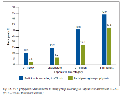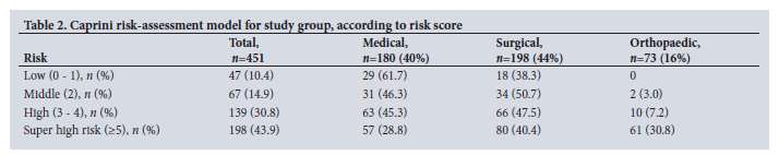 METHODS. Over a 9-month period, 451 consenting patients >18 years of age hospitalised at Charlotte Maxeke Johannesburg Academic Hospital in Gauteng, SA, were systematically included. Patients were assessed and risk stratified according to the IMPROVE (International Medical Prevention Registry on Venous Thromboembolism) bleeding risk and Caprini risk assessment tools. Data on the use of VTE thromboprophylaxis, agent and dose were collected from the hospital records.