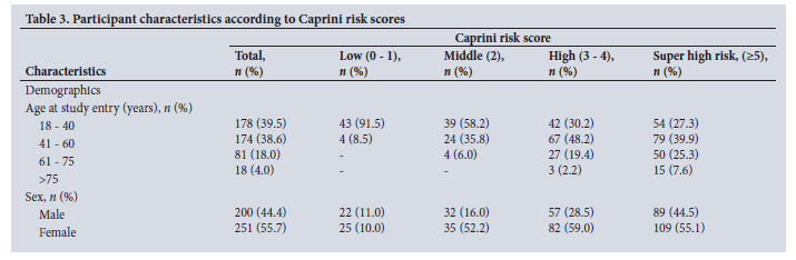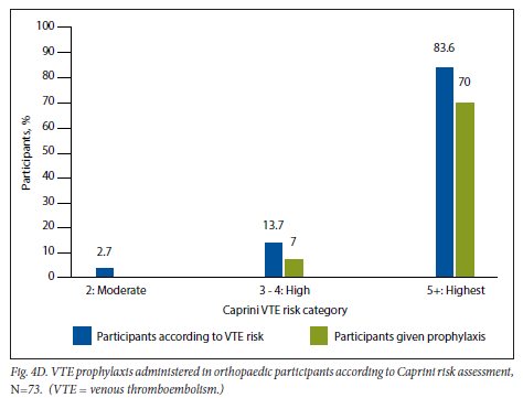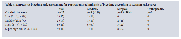 There are several limitations to this study. Firstly, this was a cross-sectional study, and as such, the length of stay was only recorded in 45% of participants. While length of hospital stay is not included in the Caprini risk assessment model, future studies are warranted to correlate length of stay and VTE risk post discharge, in particular in medical patients. Furthermore, only postoperative VTE thromboprophylaxis was prescribed to surgical and orthopaedic participants, which may have underestimated the rates of thromboprophylaxis in the study group. Secondly, it was not possible to perform a bleeding risk assessment according to the IMPROVE bleeding risk score in 143 (32.0%) participants who did not have a prothrombin time test performed. In hospitalised patients at low risk of bleeding, routine prothrombin time test testing as an assessment of liver function may negatively contribute to healthcare costs. Thirdly, medical participants from the intensive care unit (ICU) were under-represented (n=8, 2.0%), despite the hospital ICU capacity of 55 beds. Critically ill ICU participants were unable to give informed consent to participate in the study. Orthopaedic participants were also under-represented, owing to fewer hospital admissions during the study period, which may introduce bias. At CMJAH there are 330 medical and 360 surgical beds, as compared with 180 orthopaedic beds. Lastly, data on HIV status were not collected for this study population, despite a high burden of infection. According to a study of postoperative surgical patients at Universitas Academic Hospital, HIV status alone did not influence the decision to administer postoperative VTE prophylaxis.[15] However, more recent updates to the Caprini RAM have included HIV as a risk factor.[16] This inclusion reflects increasing evidence that chronic inflammation, immune dysregulation and endothelial activation associated with HIV infection predispose to thrombosis.