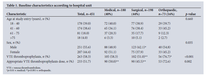 During the study period, 451 adult medical, surgical and orthopaedic participants were included (Fig. 1). Table 1 shows the baseline characteristics of the study group. The mean (SD) age of the study group was 47 (16) years. There was a higher proportion of surgical male participants than medical male participants (p<0.010). The median (IQR) hospital length of stay, which was recorded in 248 participants, was 7 (12) days.