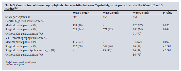 A sample of 385 patients was estimated, assuming a 1.0% incidence of VTE, at a confidence interval (CI) of 95%. The estimated incidence of VTE in hospitalised patients receiving thromboprophylaxis is 1% - 5%.[10] Moreover, the sample size was aligned with the original studies, to allow for meaningful comparison of results. Statistical analysis was performed using Statistica software version 13.2 (Statistica, USA). Normally distributed continuous data were presented as mean (standard deviation (SD)), and variables with non-Gaussian distribution as median (interquartile range (IQR)). Categorical data were presented as frequencies and percentages. Comparisons between medical, surgical and orthopaedic participants were performed using the χ2 test or Fisher's exact test when necessary. Comparisons between the Wave 1, 2 and 3 studies were performed using a one-way analysis of variance (ANOVA). Statistical significance was set at a p<0.05.