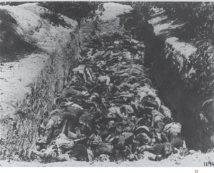 A detailed examination of the [mass grave] photographs indicates that the bodies are those of adults more than teenagers, though some of them are certainly young adults. The overwhelming majority of them are in addition men, with only a few women who can be identified amongst them. Most of the men are wearing uniforms and there is little evidence of the 'brightly coloured frocks' although several of the photographs are in colour.71