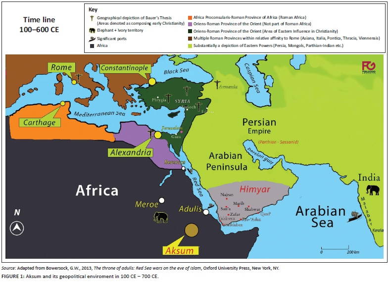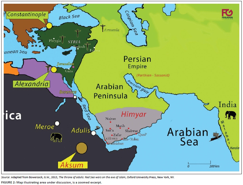 Perceivably, the trade between Rome and India is an extensively corroborated establishment; however, by extension the involvement of Aksum within this respective commerce is also implied directly. Cosmas Indicopleustes, although wrote in the 6th century, recounted that Aksumite vessels reached eastern areas, such as modern-day Sri Lanka (Christian Topography III 65; Wolska-Conus 1968-1973:1:502-505). During the 525 CE invasion of Himyar, the composition of the Byzantine-Aksumite alliance's navy was characterised by a substantial Aksumite armada. A notable fact is that these ships from Aksum were of Ethiopian origin, made at Adulis. The preceding claims by Cosmas Indicopleustes were recently entrenched by the recovery of an Aksumite copper coin and Aksumite pottery from the southern coast of Arabia. That was at the port settlement of Qana (Phillipson 2012:200). In addition, in Berenice Troglodytica, an Egyptian seaport on the western Red Sea coast, there was a discovery of a coin dated the c. 3rd - 4th century CE of Aphilas together with Aksumite pottery (eds. Sidebotham & Wendrich 2007:201, 373; Tomber 2008:104-107). This compositely implies the economic geopolitical visibility of Ethiopia in the c. 3rd - 4th century CE and possibly earlier, thereby implying the possibility of religious interexchange in the form of migrating Christians and Jews. Although essentially based on the mentioned evidence, the preceding fact remains intrinsically a possibility (see Figure 1).