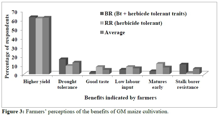 The primary source (87.4%) of insecticides used by farmers was the extension service (DRDAR). These insecticides were supplied at subsidized rates alongside other Cropping Programme inputs. According to Youm, Gilstrap & Teetes (1990:177) the provision of pesticides at subsidised rates can lead to unnecessary pesticide application on crops. Bt maize has recently been reported as still highly effective against B. fusca, the main stem borer pest of maize in the Eastern Cape Province (Kotey, Obi, Assefa, Erasmus & Van Den Berg 2017:206). Insecticides reportedly applied by farmers may therefore be preventative rather than curative. Kruger et al. (2012:44) reported that a high proportion of maize farmers in the main maize producing region of the Highveld area of South Africa applied insecticides as preventative sprays on Bt maize irrespective of stem borer infestation levels. Hellmich, Albajes, Bergvinson, Prasifka, Wang & Weiss (2008:145) suggested that reduction of insecticide use alongside the maintenance of other traditional IPM tactics represent the best use of Bt maize. The preventative use of insecticides is also at variance with the basic tenets of IPM which suggests that insecticide use may be appropriate when pest populations cannot be suppressed by other strategies Mannion & Morse (2013:21) showed that farmers' perceptions of Bt crops can play an important role in the reduction (or not) in the volume of pesticides applied onto such crops. In this study, there was a significant (P = 0.004) relationship between type of GM maize currently cultivated and farmers' perception of the benefit of cultivating GM maize. More farmers cultivating hybrids with both Bt and herbicide tolerant traits (BR) maize perceived it as drought tolerant whilst more farmers planting hybrids with only the herbicide tolerance trait (RR) perceived it as early maturing. The majority of farmers that cultivated BR maize (62.8%) and RR maize (61.8%) however cited higher yields as the main benefit obtained from cultivating GM maize (Figure 3). The proportion of respondents that were aware of GM maize as an insect pest and weed management tool was generally low. Only 10.7% of BR maize farmers and (8.1%) of RR maize farmers respectively realized that stem borer resistance or herbicide tolerance (low labour input) were the advantages associated with GM maize cultivation. Furthermore, only 4.9% of BR maize farmers and 34% of RR maize farmers who reported high yield as an advantage of GM maize related this advantage to the stem borer resistance and herbicide tolerance traits of the GM maize varieties they cultivated.
