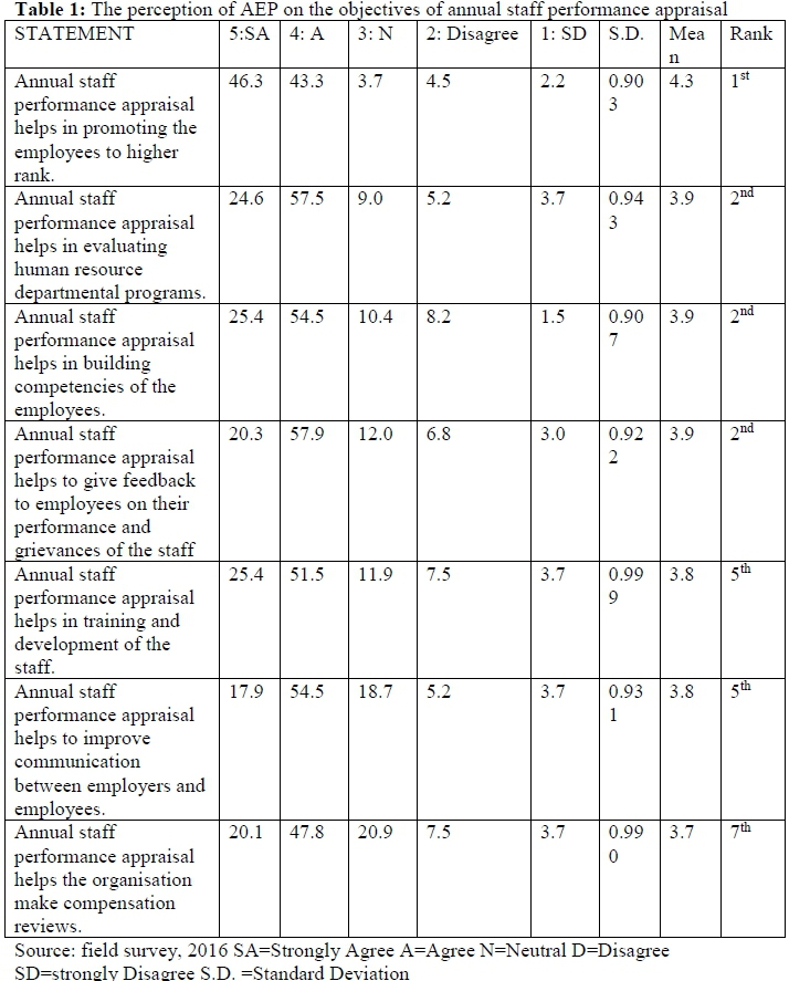 1. Examine the perception of employees on the objectives of annual staff performance appraisal.
