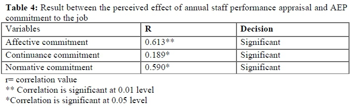 There is a positive significant relationship between perceived effect AEP performance appraisal method and AEP commitment to the job as shown in Table 4. The results revealed that the percentage contribution of the method of application of PAS on AEP commitment to the organisation. The method contributed 61.3% to affective commitment, 18.9% to continuance commitment, and 59.0% to normative commitment as shown in Table 4. The results revealed that application of PAS is highly effective to AEP commitment to the organisation
