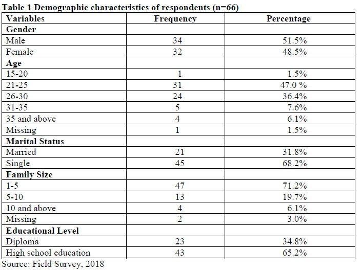 Regarding marital status, majority (68.2%) of respondents was single and 31.8% were married. This finding is similar to Zakaria et al. (2013), from the University for Development Studies, Ghana. The findings also reveal that majority (71.2%) has a family size of 1-5, 19.7% has 510 people, 6.1% has 10 people and above and 3% did not indicate their family size. Regarding educational level, majority of the respondents (65.2%) acquired high school education and 34.8% had diploma. This indicates that most of the respondents came to the University straight from high school. In a similar study in Ghana, Zakaria et al. (2014) reported that age, marital status, place of domicile, parental educational background of students, practical agricultural experience and risks tolerance were found to have significant influence on students' intention to take up agribusiness as a source of future self-employment avenue or not. This further emphasized the role of demographic characteristics of students in deciding future employment.