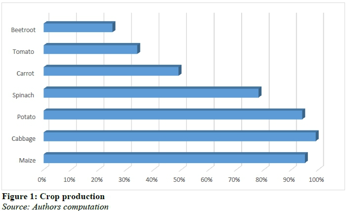 The results indicate that cabbage (99%), maize (95%) and potato (94%) were the most produced crop in Mnquma. All the respondents who claim to be producing in their small gardens planted all the three crops in the previous production season. This is in line with what Christian et al. (2017) found Nqamakhwe and surrounding areas of Transkei. There are some households that produced carrots (49%), tomato (34%) and beetroot (25%).