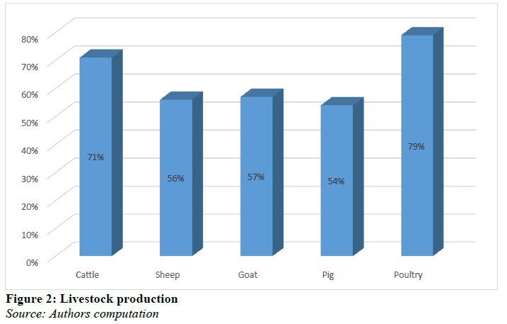 Results of the field survey revealed that majority of the farmers practice mixed farming with majority of farmers involved in livestock production. The main livestock kept by households in Mnquma include indigenous chicken (79%) and cattle (71%). The widespread farming of chickens may be due to their easy accessibility as they are relatively cheap and the lending is more common in chickens than in any other livestock types. Goat (57%), sheep (56%) and pigs (54%) were the least kept animals in Mnquma. Most households indicated that fewer households own livestock now as compared to the olden days. Respondents who were practicing large-stock production (Cattle) also stated that the main reason for their involvement is the availability of pastures and they consider cattles as a form of wealth and security. There were however some households that did not own any of these livestock types. Following discussions during data collection, they pointed out that the cost of purchase, vaccines and diseases are the main reasons for not keeping such animals. In around 1996, the majority of farmers in the Eastern Cape were hard hit by "Umbendeni" (red-water disease) that resulted in a massive deaths of cattle's. The average household livestock holdings are presented in Figure 2.