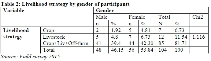This sub-section provides evidence as to whether or not the choices of livelihood strategy isinfluenced by gender. Accordingly, the findings provide a supporting evidence of statistically significant effect of livelihood strategy on gender shown on Table 2. After controlling other variables, it has been found that on average, about 1.92, 4.8 and 39.4 percent of participants who were male and had crop, livestock, crop+livestock+off-farm strategy.