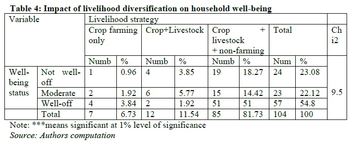 This section provides evidence as to whether or not the choices of livelihood strategy had brought any improvement in household well-being. Accordingly, the findings provide a supporting evidence of statistically significant effect of livelihood strategy on household well-being shown on Table 4. After controlling other variables, it has been found that on average, about 0.96, 3.85 and 18.27 percent of participants who using crop farming, crop and livestock and crop plus livestock plus off farm strategies were not well-off respectively. The findings also show that, on average about 3.84, 1.92 and 51 percent of the sample participants who use crop only, crop and livestock, crop plus livestock plus off farm strategies were well-off, respectively.