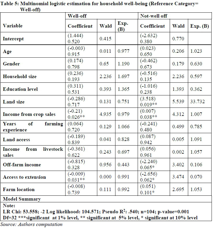 The results in table 5 below show the estimated coefficients, Wald statistics and exponential betas of independent variables in the model. Table 4.3 shows that, the likelihood ratio (x2) value was 104.57 (df = 32; p= 0.001) and this was significant at 1% level of probability. The pseudo R2 value of 0.540 shows the variation in the well-being status. Land size, income from crop sales, off-farm income and access to extension services had a positive effect on household well-being. Land did not have influence on household well-being as all the participants indicated that they had access to land.