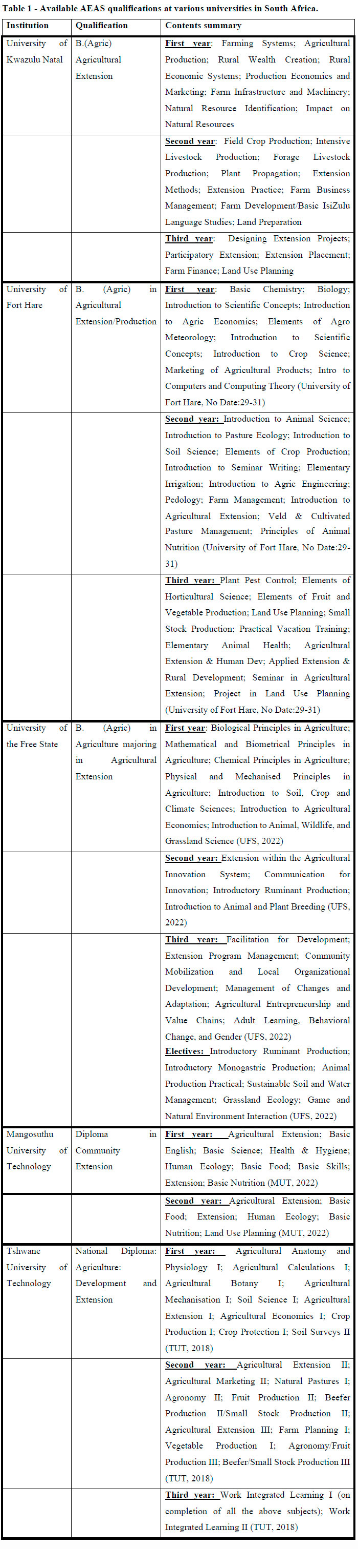 The contents of South African agricultural extension curricula differ vastly among the many tertiary educational institutions that offer training (Davis et al., 2021). Qualifications vary from three-year undergraduate degrees, postgraduate degrees, diploma courses, and single subjects available to students. Contents vary between the qualifications. Some include training in the competencies mentioned previously; others do not. In many instances, the available agricultural extension curricula in South Africa still focus predominantly on production/technical training (Davis et al., 2021). The current available undergraduate agricultural extension qualifications are summarised in Table 1.