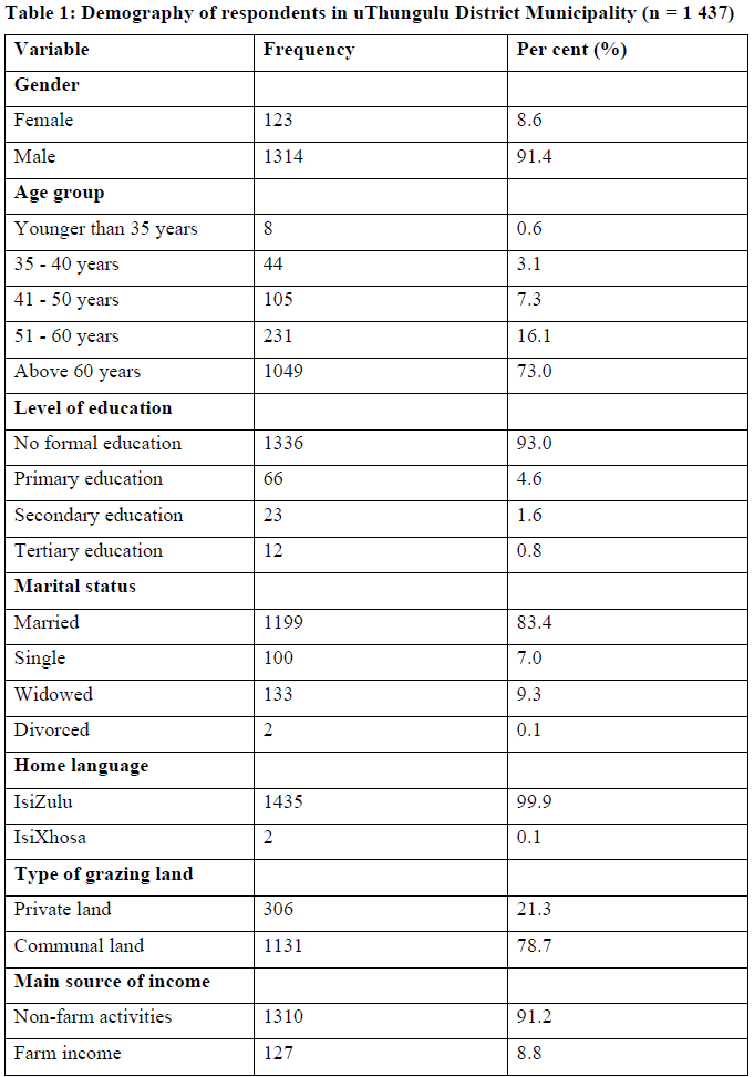 The demographic characteristics of the respondents are presented in Table 1. The results shows that there were more men (94%) in livestock farming than women in the study area. The age group of most respondents (73.0%) was above 60 years and only 0.6% of the farmers were younger than 35 years. The mean farming experience was found to be 12.5 years for the sample. Marandure, Mapiye, Makombe, Nengovhela, Strydom, Muchenje and Dzama (2016:201) also noted in their study that the majority (>60%) of communal livestock farmers in South Africa were elderly people, and only 15% were younger than 40. This could be attributed to the fact that most farmers are from previously disadvantaged groups. In this current study, the results indicate that majority of the farmers (93%) did not have formal education. In comparison to other rural areas, the education level of farmers in uThungulu District Municipality was lower than that of farmers in uThukela District Municipality within the same province, as reported by Gcumisa, Oguttu and Masafu (2016:615), who found that about 27.5% of their respondents had no education.
