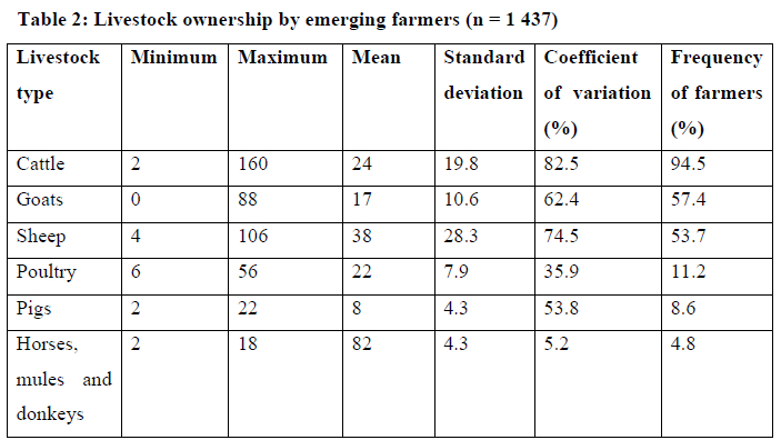 Table 2 gives a summary of livestock ownership in the study area. The results indicate that the types of livestock owned by emerging farmers in uThungulu District Municipality were cattle, goats, sheep, poultry, pigs, horses, mules, and donkeys. This is in line with Leeuw et al. (1995:199) and Mapiye et al. (2009:201), who reported that livestock farmers in South Africa keep beef and dairy cattle, mutton and wool sheep, meat, milk and mohair goats, pigs, ostriches, ducks, turkeys, chickens (broilers and egg layers), horses and donkeys, among others. The majority (94.6%) of the farmers owned cattle compared to other types of livestock. The mean number of livestock types also shows that on average smallholder farmers kept more sheep (38), followed by cattle (23), poultry (22) and goats (17) on their farms (households). There is a high disparity in the number of cattle, goats, sheep and pigs as shown by the CV% in Table 2. However, the variation for poultry is medium, while the number of horses, mules and donkeys kept by the respondents varied lowly. According to Gomes (2009:477), CV below 10% is considered low, 20-30 is medium and high if is above 30%.