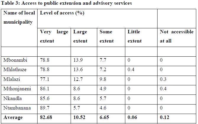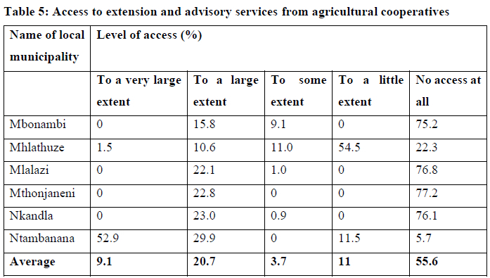 Table 5 shows the level of access to extension and advisory services from agricultural cooperatives. The findings indicate that on average the majority of the respondents (55.6%) had no access at all to agricultural extension and advisory services from agricultural cooperatives. The local municipality which had high access to extension and advisory services from agricultural cooperatives was Ntambanana (82.8%) as shown by the combined proportion of access to a very large extent and large extent. In the other local municipalities, less than 25% had high better access to extension and advisory services from agricultural cooperatives. This is an indication that in some local municipalities in uThungulu District, agricultural cooperatives are well organised, whereas in others they are not. Alternatively agricultural cooperatives in other municipalities do not offer or lack extension services.