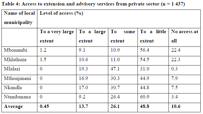 Table 4 shows the level of access to private extension and advisory services by emerging livestock farmers in uThungulu District Municipality.