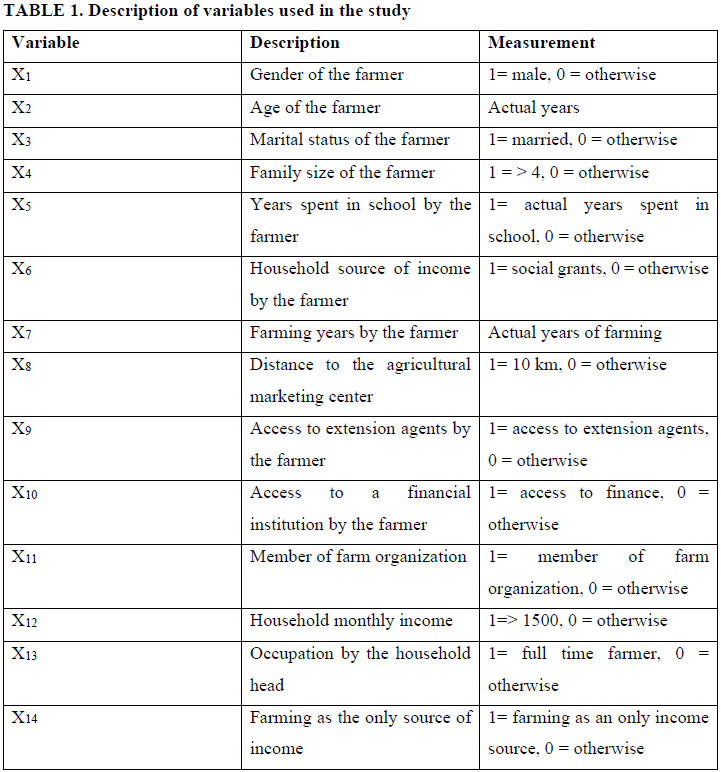 For this paper, the two choices are "adopting modern farm technologies" or "not adopting modern farm technology". A twofold regression was established to explain Y=1 for a state anywhere the farmer did retrieve media usage in the farm and Y=0 for states wherever the farmer did not retrieved media usage in the farm foundations. Based on the assumption that X is a trajectory of eloquent variables and p is the likelihood that Y=1, dualistic probabilistic associations as quantified by (Awili et al., 2016). This can be measured as follows: