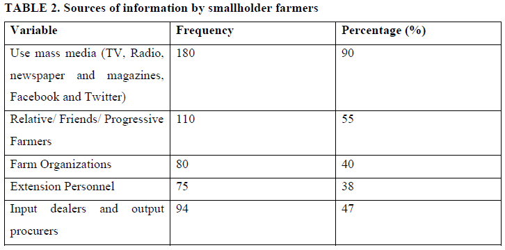 Farming generally is changing rapidly due to technology advancement and growing population which needs to be fed. As a result, farming landscapes throughout the world, especially developing countries have adopted innovative technologies in their farming. Such information on technological change and new practices in the farming system is dispersed by several sources or communication agents. The use of media does play an imperative role in information delivery to the farming community. The use of media in the form of radio and television is the most effective media for spreading scientific knowledge to the masses (Chauke et al., 2013). Newspaper and magazine, cell phones, Facebook, and Twitter are other media being used by literate farmers and increasing the rate of literacy in the country offers new opportunities for using the print medium as a means. Table 2 below illustrates sources of information by smallholder farmers.