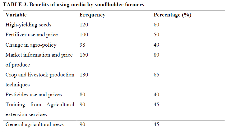 Farmers are benefiting a lot from the use of innovative technologies being used in farming, especially media use for agricultural purposes. As a result, most farmers throughout the world have experienced an increase in their productivity which ultimately enhances their farming profitability and farm welfare. Table 3 below shows the benefits of media usage by smallholder farmers in the study area.