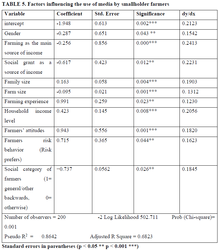 This research made use of the Logit regression model to investigate socio-economic drivers influencing the use of media for agricultural purposes by smallholder farmers in the Eastern Cape Province. Table 5 shows the estimated results from the Logit regression analysis and further explains the model fit. An earlier rustle to econometric evaluation and results and different measurement traditions were subjected to test. Encountering heteroscedasticity and multicollinearity challenges is almost inevitable in a cross-sectional data set. To verify and discourse the multicollinearity issue, a pair-wise association environment was made and led to dropping some of the variables showing multicollinearity. Likewise, a robust standard error calculation of the Logit regression model was used as a proxy and resolution for the Brush Pagan test (hettest) of discovering heteroscedasticity. The Variance Inflation Factor (VIF) was engaged to test the existence of multicollinearity among independent variables. Secondly, the presence and elimination of immaterial and pertinent variables were correspondingly tested by link and OV (Omitted Variable) tests. The issue of heteroscedasticity was further examined with the use of the Breusch-Pagen test (hettest). The unequal variance was unfortunately detected; therefore, the robust standard error estimate was used as a treatment. The Pseudo R2 indicates that the dependent variables in the Logit regression explained 86.4% variations in the adoption of modern farm technology probability. The likelihood ratio Chi-square value of 502.711 with a p-value of 0.001 expresses that the model used is statistically sub substantial.