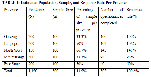 The population in this study comprised small-scale agro-processors chosen from the study area. Due to the informal nature of the enterprises and their traditional background and meagre economic contributions, South Africa's government institutions do not have a formal database to derive their accurate population. The study population was estimated to be 1150 small-scale agro-processors, based on their concentration in various centres of the study areas. The target population was owners and managers of small-scale agro-processing enterprises located within the study area. According to the province, a stratified random sampling technique was used to select 503 respondents. When randomly selecting people from a population, these characteristics may or may not be present in the sample in the same proportions; stratification ensures their representation (Creswell et al., 2017). Identifying whether the sample contains individuals in the same proportion as the character appears in the entire population within each stratum is appropriate. Stratified sampling was appropriate for this study since the number of agro-processing firms differed from province to province. The provinces were selected due to the value of the agricultural activities in each province. A sample calculator was used to calculate the sample size per province. Table 1 depicts that Limpopo and North West Province received a higher response rate than anticipated, while Mpumalanga and Free State's response rate was below expectation.