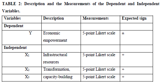 The analysis of this study was conducted through multiple linear regression modelling. The assumption was that X1, X2 and X3 are the predictors of economic empowerment variables as informed by the human capacity-building theory (Munyigi et al., 2024). Table 2 provides the measurement. Gujarati (1992) suggested that the multiple linear regression model should be specified as depicted by the following: