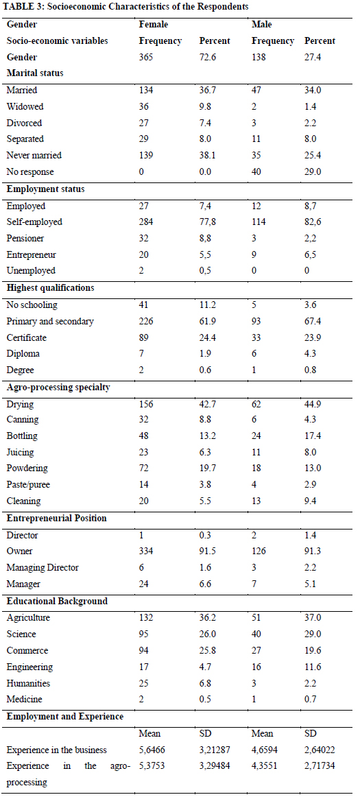 The participants' descriptive analysis was presented to provide a picture of the representativeness of the study sample (Khoza et al., 2019). The descriptive results analyse the characteristic demographic profile in an empirical study and establish the biographical parameters of the sampled participant group (Mazibuko, Smith & Tshuma, 2018). Table 3 exhibits the socioeconomic characteristics of small-scale agro-processors in South Africa. Researchers have shown that the respondents' demographic profiles are central to determining their capacity.