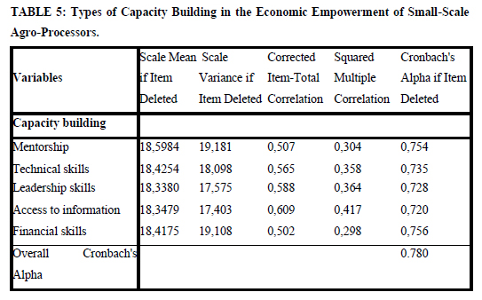 Table 5 below shows that mentorship, technical, and leadership skills have the highest Cronbach's Alpha of 0.754, 0,735, and 0,728, respectively. This shows that the South African government should invest in mentorship programmes and technical and financial skills to achieve increased capacity building for small-scale agro-processors, significantly influencing the economic empowerment of small-scale agro-processors. Since the agricultural extension officers are responsible for the capacity building of small-scale agro-processors, they should dedicate their resources towards mentorship and technical and leadership skills to achieve the economic empowerment of small-scale agro-processors in South Africa.