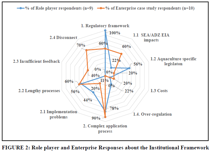 Responses about the impacts of the institutional framework were categorised into the regulatory framework and complex application processes (Figure 2). Enterprise respondents felt most strongly about the impacts of environmental processes (60%), while role-player respondents were most concerned with aquaculture-specific legislation (56%). Enterprise concerns mainly were related to the Environmental Impact Assessment (EIA) recommendations for the Saldanha Bay Aquaculture Development Zone (ADZ), which limited total bivalve shellfish production to 10,000 tonnes per annum (TPA) for the first two years, and annual incremental increases by 5,000 TPA thereafter to a maximum of 27,600 TPA (DAFF, 2017). This limited farmers' ability to operate at full capacity. The problem of finding a balance between responsible regulation and optimal production levels is also experienced elsewhere, such as Norway's salmon aquaculture industry (Osmundsen, Almklov & Tveteras, 2017).