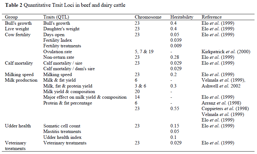 In dairy cattle the loci responsible for milk production and protein and fat content have received considerable attention. Initially, milk yield and protein quantity were linked to chromosomes 14 and 21 by Coppieters et al. (1998) and Vaiman (1999) respectively, which led to further work and the discovery of five possible regions associated with milk and protein yield, fat and protein percentage and milk yield, fat and protein yield, fat yield and protein percentage on chromosomes 1, 6, 9, 10 and 20, respectively (Vaiman, 1999). Potential QTL for fat percentage and yield and protein percentage were recently reported for chromosomes 3 and 6 respectively (Ashwell et al., 2002; Nielsen et al., 2002). Conformational type traits, associated with dairy form and milk yield have been found on chromosome 27 (Ashwell et al., 1998; Sonstegard et al., 2001).