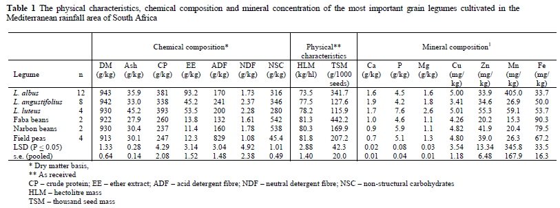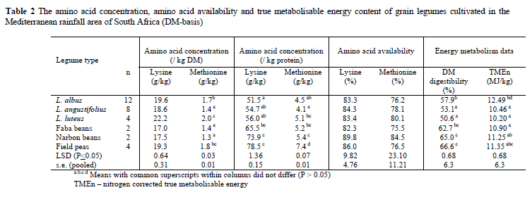 Grain legumes contain moderately high levels of protein and amino acids and are promising alternatives (Wiseman, 1987; Brand et al., 1995). Grain legumes that are cultivated in the Mediterranean rainfall area of South Africa include lupins (Lupinus spp), faba beans (Vicia faba), field peas (Pisum sativum) and narbon beans (Vicia narbonensis). Among these lupins normally contain the highest concentration of protein (299-357 g/kg; May et al., 1993), followed by faba beans (234-388 g/kg; Garrido et al., 1991), peas (145-285 g/kg; Reichert & MacKenzie, 1982) and narbon beans (210-228 g/kg; Eason et al., 1990). However, comparative studies on the composition and nutritive value of the different types of lupins (L. luteus, L. albus and L. angustifolius), faba beans and narbon beans for monogastric animals are limited.