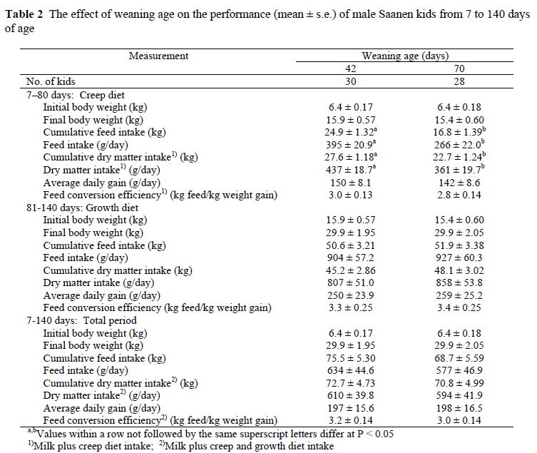 Morand-Fehr (1976) reported that there was no detrimental influence due to weaning when Alpine kids were consuming 30-50 g dry feed per day. As seen from Table 2, the Saanen kids had, due to their normal growth pattern, a faster growth rate between 81 and 140 days on the growth diet, than between 7 and 80 days on the creep diet. In addition, the results of the present study associated with live weight values are consistent with those reported in the literature (Morand-Fehr et al., 1982).