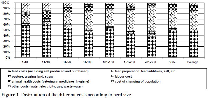 Expenses caused by changes in herd size (losses caused culls) were the highest in farms of the smallest category (5%), the total calculated average was around 1%. In the case of other (stable) expenses (water, electricity, gas, heating material, waste water, etc.) a constant proportional decrease was observed until the 101-150 category (from 12 to 2%), growing to 6% in the next category and showing a decreasing tendency again. Its relative proportion was 5% as compared to total costs.