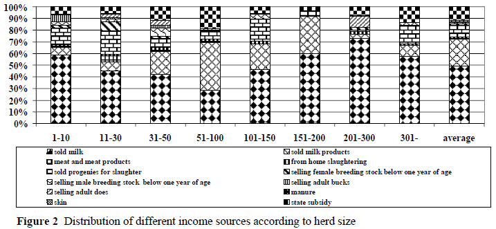 Sold offspring as an income source indicates the proportion of money from selling kids for slaughter. It was 20% in the 11-30, 19% in the 101-150 and 14% in the >300 categories. Income from selling young breeding animals was found to be very low. It was the highest (around 10%) in the 11-30 and 31-50 categories. Selling bucks and adult does was more typical for the smaller farms. However, income for sold does was the highest in the 201-300 category (10%).