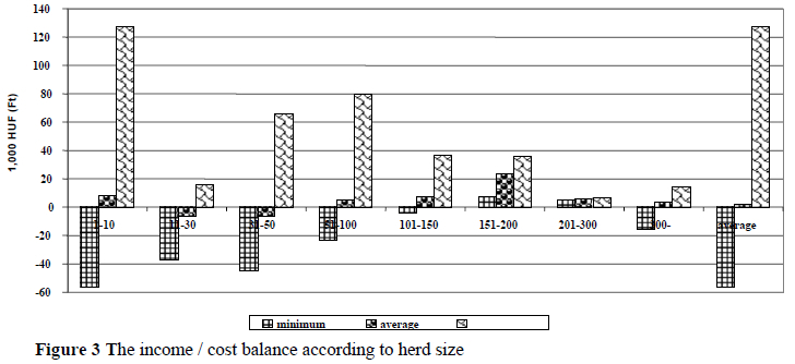 A minimum herd size is needed for covering fixed and variable expenses. Income is increased by the number of productive animals which ensures the covering of expenses, but only to a certain herd size. In the smallest category the positive balance (8 000 HUF/goat) turned to a negative balance in the next category (Fig. 3.). The average balance became positive again (6 000 HUF/goat) in the 51-100 category. The balance increased in the subsequent categories reaching the highest in the 151-200 (26 000 HUF/goat) category, then decreased again to 2 000 HUF/goat.