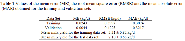 In this work, a methodology different from the standard in prediction problems has been followed. The data set has been divided into two sets (28 goats for training purposes, and eight for the validation of models); with the first set - training set - the model has been developed and with the second one - validation set - the accuracy of the model was tested to be extrapolated to the rest of the cases. Thus, we had a way to validate the developed model.