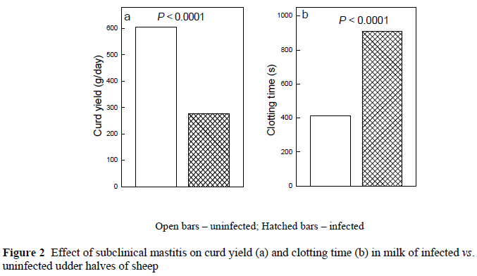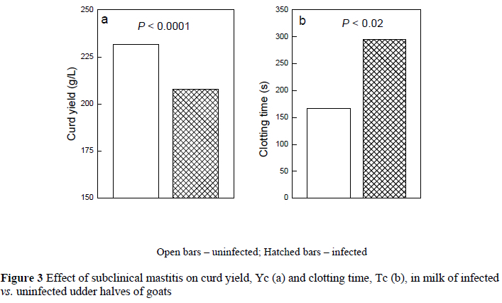 Udder infection in dairy sheep and goats has a major effect on reducing both yield and quality of milk, thus leading to greater economic losses than those reported for dairy cattle (Watson & Buswell, 1984). In an earlier study on 1000 sheep from 20 Israeli dairy flocks (Leitner et al., 2004a) and 500 goats from 10 Israeli dairy herds (Leitner et al., 2004b), it was found that milk yield of the uninfected udder halves was significantly higher whereas fat and total protein levels were lower compared with the infected ones. However, in that study a direct comparison between infected and uninfected glands was not possible because the measurements were based on animals rather than single-glands, with some animals having one infected and one healthy gland. The present study focused on how subclinical mastitis at the gland level in dairy sheep and goats affected milk yield and other compositional changes in relation to curd yield.