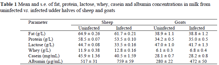 In both sheep and goats some of the milk constituents are significantly influenced by the presence of intra-mammary infection. Milk of infected glands has a significantly lower concentration of lactose, which is accompanied by significantly higher whey and albumin concentrations. The accumulation of whey proteins probably results from a breakdown of the caseins and other milk proteins, which down-regulate milk secretion (Silanikove et al., 2000; Shamay et al., 2003) and explain the lower lactose concentration.