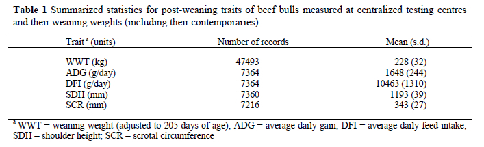 The dataset consisted of ADG, DFI, SDH and SCR of individual bulls tested between 1990 and 2003, with available weaning weight (WWT) and weaning management group information as well as the weaning weights of their contemporaries (herd-mates). Only those animals coming from a weaning contemporary group with three or more sires in the group were considered for the analysis and all records (weaning and post-weaning) greater than three standard deviations from their own contemporary group mean were eliminated. The final data after editing (n = 47493) consisted of 7364 bulls with WWT and post-weaning traits as well as 40129 WWT of their contemporaries, from 2238 sires and 26984 dams. There were 1421 weaning contemporary groups, 502 post-weaning test groups and 727 herd of origin by year groups. Summarized statistics for the data are presented in Table 1.