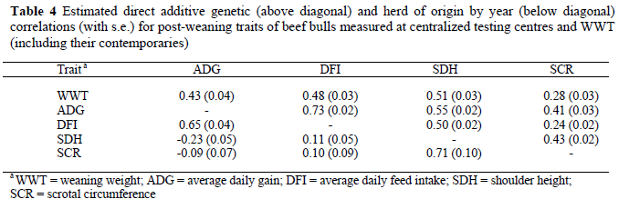 The estimated additive genetic and herd of origin by year correlations among WWT, ADG, DFI, SDH and SCR are reported in Table 4. Estimates of genetic correlations amongst traits were low to moderate, with the exception of ADG with DFI. The high positive genetic correlation (0.73) between ADG and DFI could be unfavourable because selecting for fast growing animals would lead to correlated increase in feed intake. The estimated genetic correlations are well within the range of published estimates (Koots et al., 1994b; Maiwashe et al., 2002; Schenkel et al., 2004). The estimated herd of origin by year correlations ranged from -0.23 to 0.71.