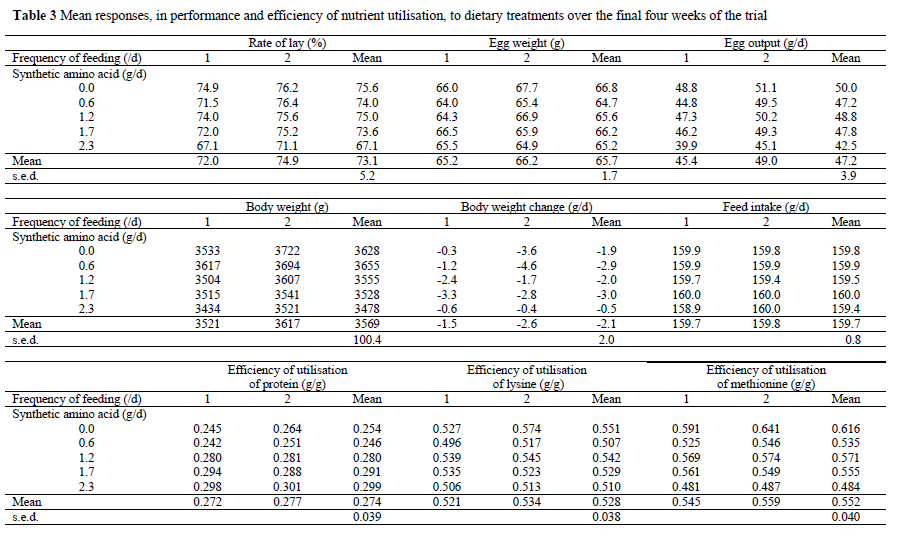 Those hens that laid for not more than one week during the final four weeks of the trial were excluded from the analysis because their efficiencies of utilisation of protein and amino acids would be extremely low (Fisher, 1980), leading to discontinuous protein synthesis and hence large differences in protein and amino acid utilisations between birds.