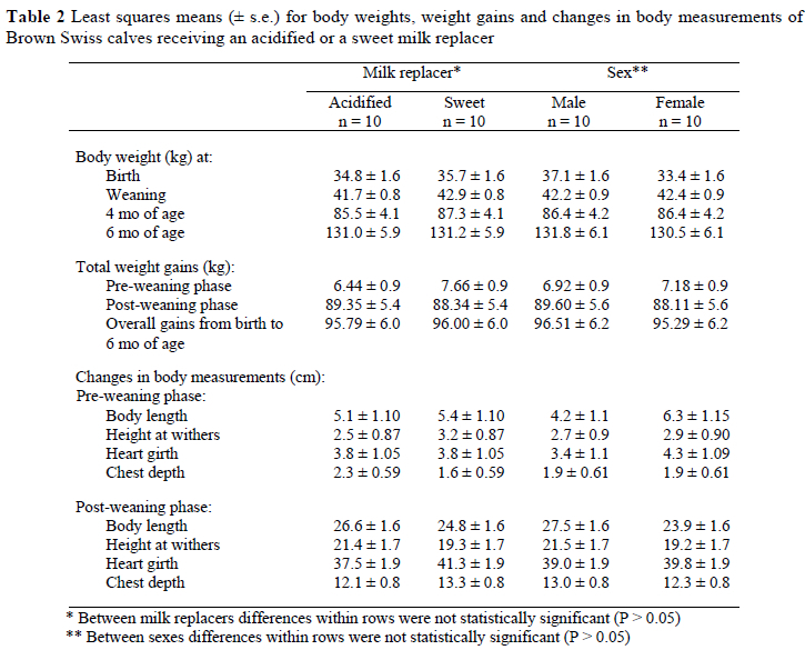 Body weights for calves determined at birth, weaning, four and six months of ages were similar between treatments (Table 2). Similar results were reported by Daenicke (1983) who stated that weekly weights of calves consuming AMR during the entire growth period were comparable to those of calves fed SMR. Influence of sex of calves on the weights at various stages of growth was not statistically significant, as also noted by Yanar et al. (1997).
