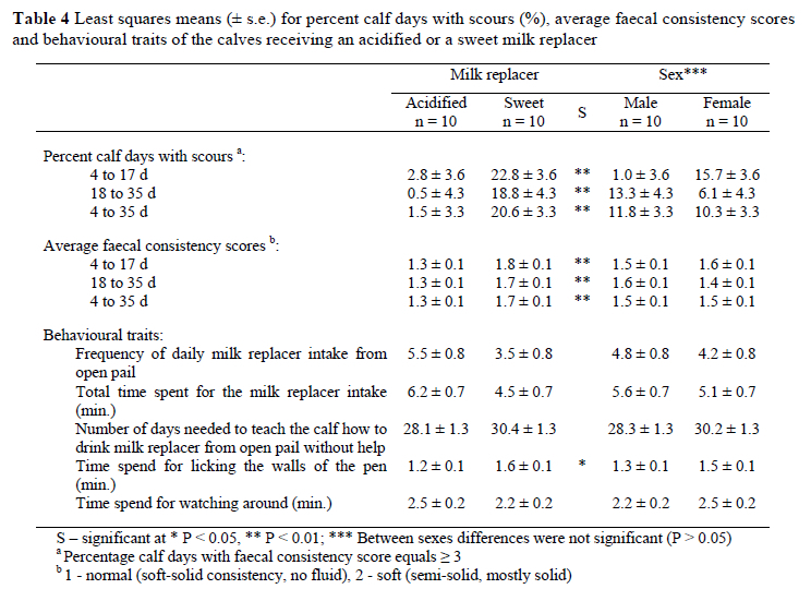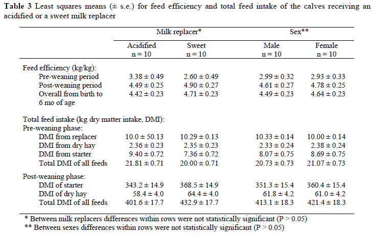 Results of the study suggested that growth, feed intake and feed efficiency characteristics of Brown Swiss calves reared under the new calf feeding program with acidified milk replacer were similar to calves receiving a sweet milk replacer. However, occurrence of scours of the young calves was noticeably lower and health status of the calves was improved.