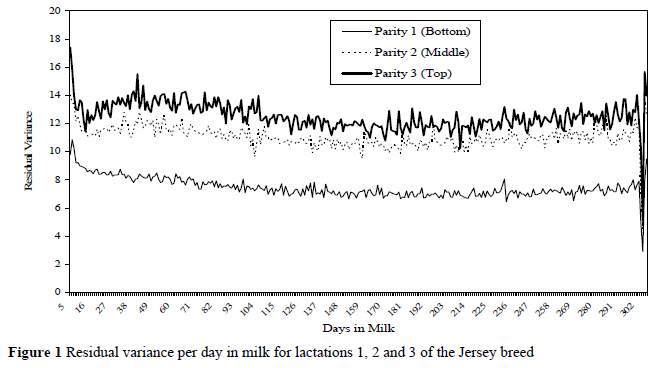 Figure 1 indicates residual variances across the lactation. It is clear that residual variances are higher in the beginning of all lactations compared to tests in the middle of the lactation, with erratic behaviour, due to only few tests available at the end of the lactations. Residual variances of first lactations are dramatically lower during all stages of the lactation compared to second and third lactations, while that of second and third lactations are more comparable. Third lactation test-day records show the highest variance throughout the lactation. Adjusting for heterogeneous variance due to days in milk and parity will therefore render an improvement on the March 2005 national genetic evaluation.