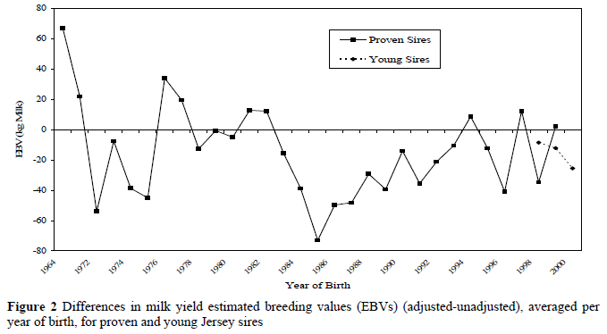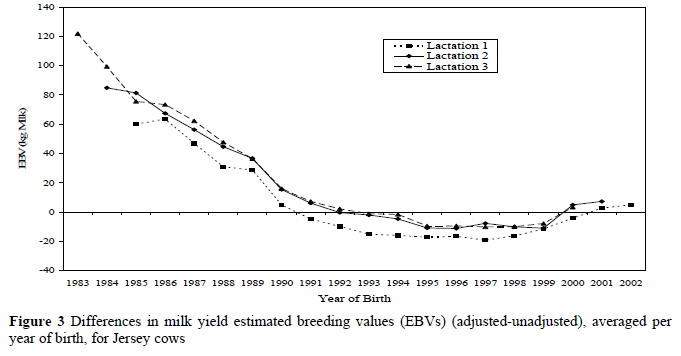 In Figures 2 and 3 the differences in milk yield EBVs, averaged per year of birth, between the adjusted and unadjusted data, are indicated for sires (Figure 2) and cows (Figure 3).