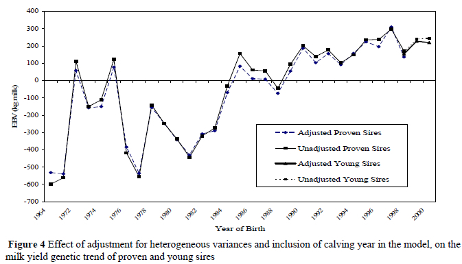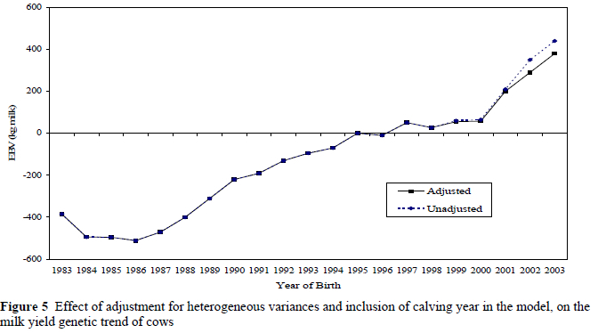 Figures 4 and 5 indicate the effect of adjustment for heterogeneous variances and the inclusion of a fixed calving year effect in the model on the genetic trend of milk yield for sires and cows, respectively. The genetic trend for proven sires is generally lower for the adjusted evaluation, especially for sires born from 1983 to 1993 and again in 1996. For the young sires the adjusted evaluation also yielded a lower genetic trend, with the youngest sires showing the largest decline in trend. For the cows, adjustment and adding a fixed calving year effect to the model only influenced the younger cows, with the adjusted evaluation yielding a significantly lower trend for cows born after 2001. Similar tendencies were observed for butterfat and protein yields, resulting therefore in a lower percentage of young animals being in the top bull and cow rankings compared to the unadjusted evaluation. Reents et al. (1998) also observed that highest genetic trends were found for models without any adjustment and smallest with models with a strict adjustment for heterogeneous variances.