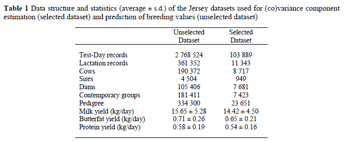 In Table 1 the data structure and statistics of the datasets for (co)variance component estimation and for prediction of breeding values, are presented. From this table it can be seen that 3.75% of the data was selected for (co)variance component estimation. Since a higher proportion of first lactation records (77%) relative to second and third lactation records was included in the selected dataset compared to the unselected dataset (42% first lactation records), averages in the selected dataset were slightly lower for all traits compared to the unselected dataset.