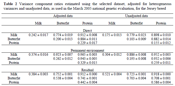 In Table 2 variance component ratios estimated based on adjusted records from the selected dataset, as well as variance components used in the March 2005 national genetic evaluation (unadjusted records), are listed.