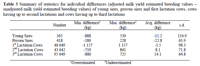 Although bull and cow rankings as well as differences between the two analyses, averaged per year of birth, were not dramatic, significant changes for individual animals were found between the two models. Table 3 indicates that the average EBVs of proven and young sires and first lactation cows were lower after adjusting for heterogeneous variances and fitting a calving year to the model, therefore these EBVs were previously on average, overestimated. Second and third lactation cows' averages, were higher after these changes to the model. These EBVs were therefore previously, on average, underestimated. Individuals that differed most, were first lactation cows, with proven sires being the least affected.